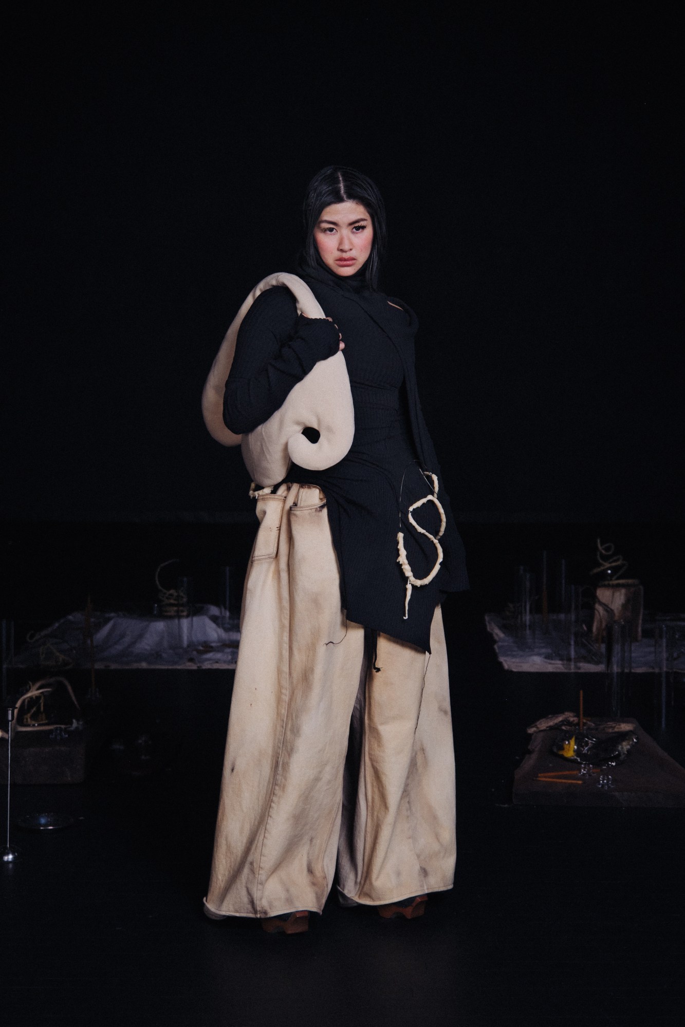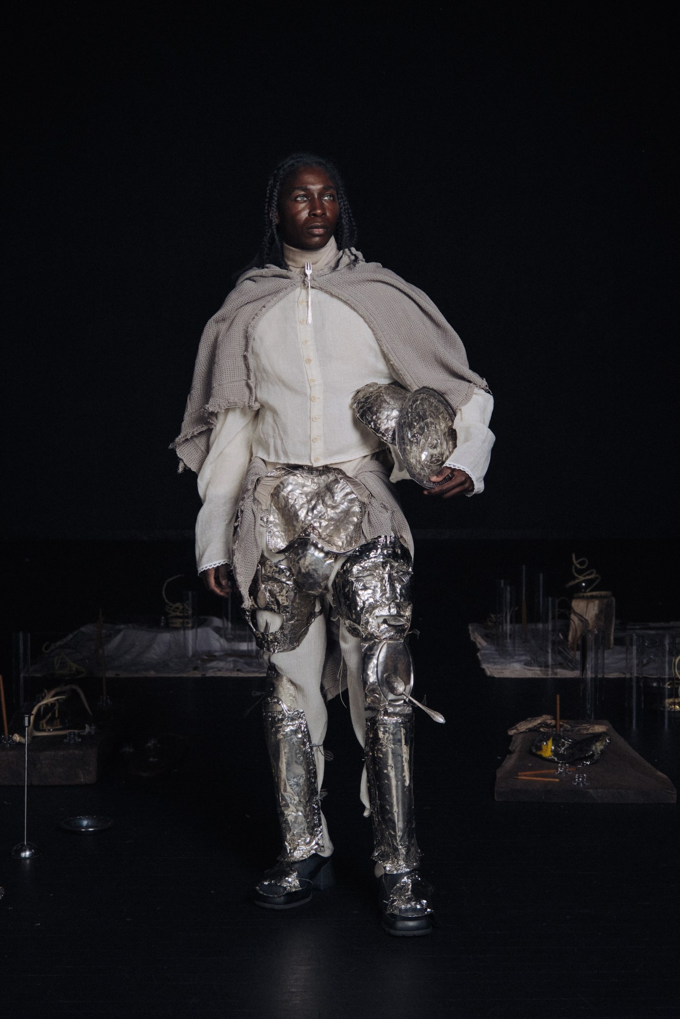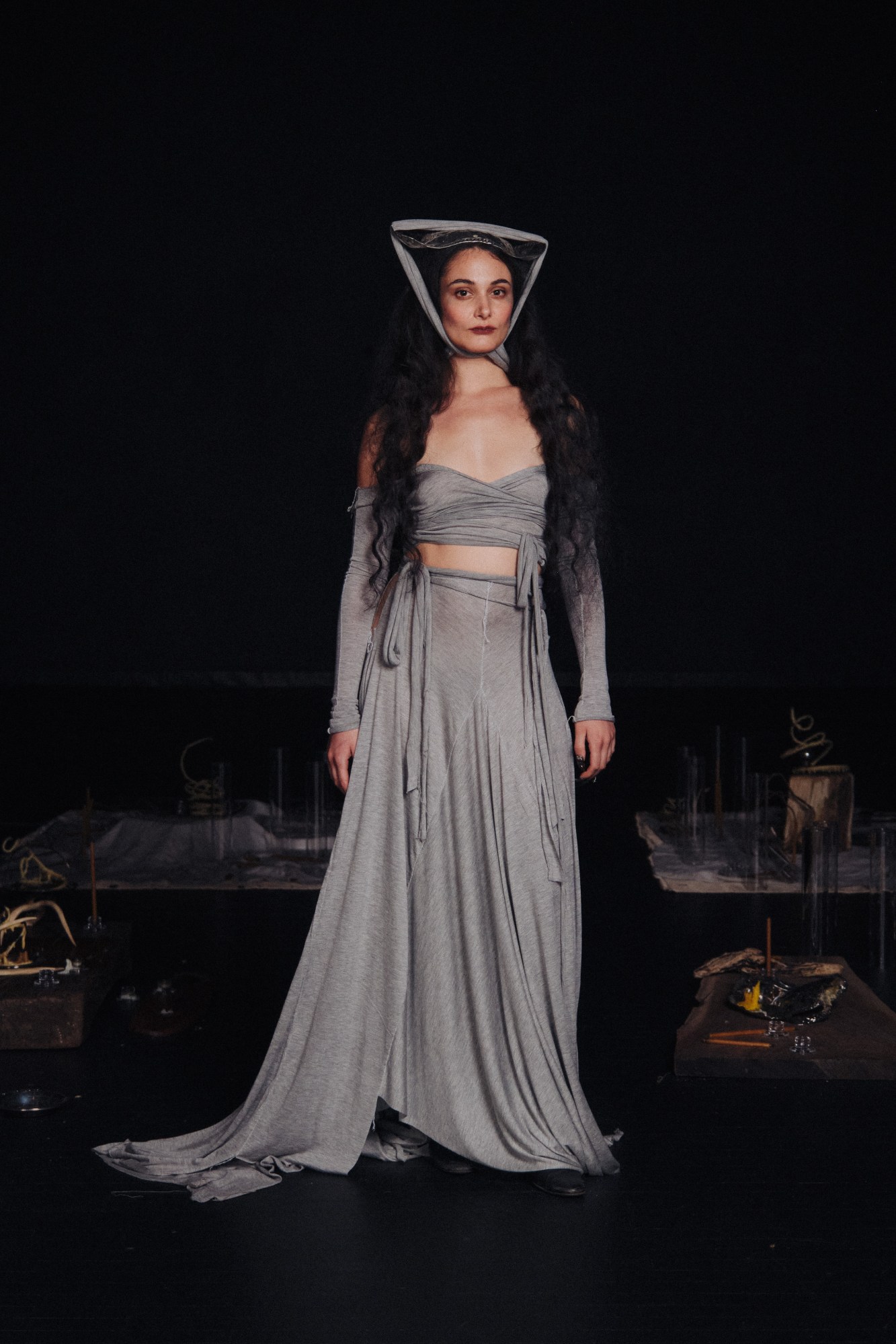 At Whalen’s studio the day following her NYFW on-calendar debut, she admitted that the candlelight was “counterintuitive.” But the 30-year old designer “felt ready to try something complex that fully encompassed and embodied the depths of my vision that I have for clothing.” Since launching her eponymous label in 2022, Whalen’s collections have held a mirror to her personal mythology, exploring ephemerality, anxiety, and tranquility. Her latest, titled “i’minlovewitheverythingandiknownothingatall,” reckons with the darkness and tragedy that pervades our current climate. Whalen’s response to a pervasive sense of doom is to find hope and empowerment through community: “Together, we create our own light.”