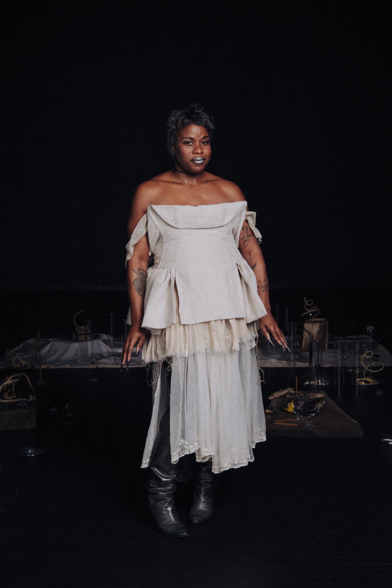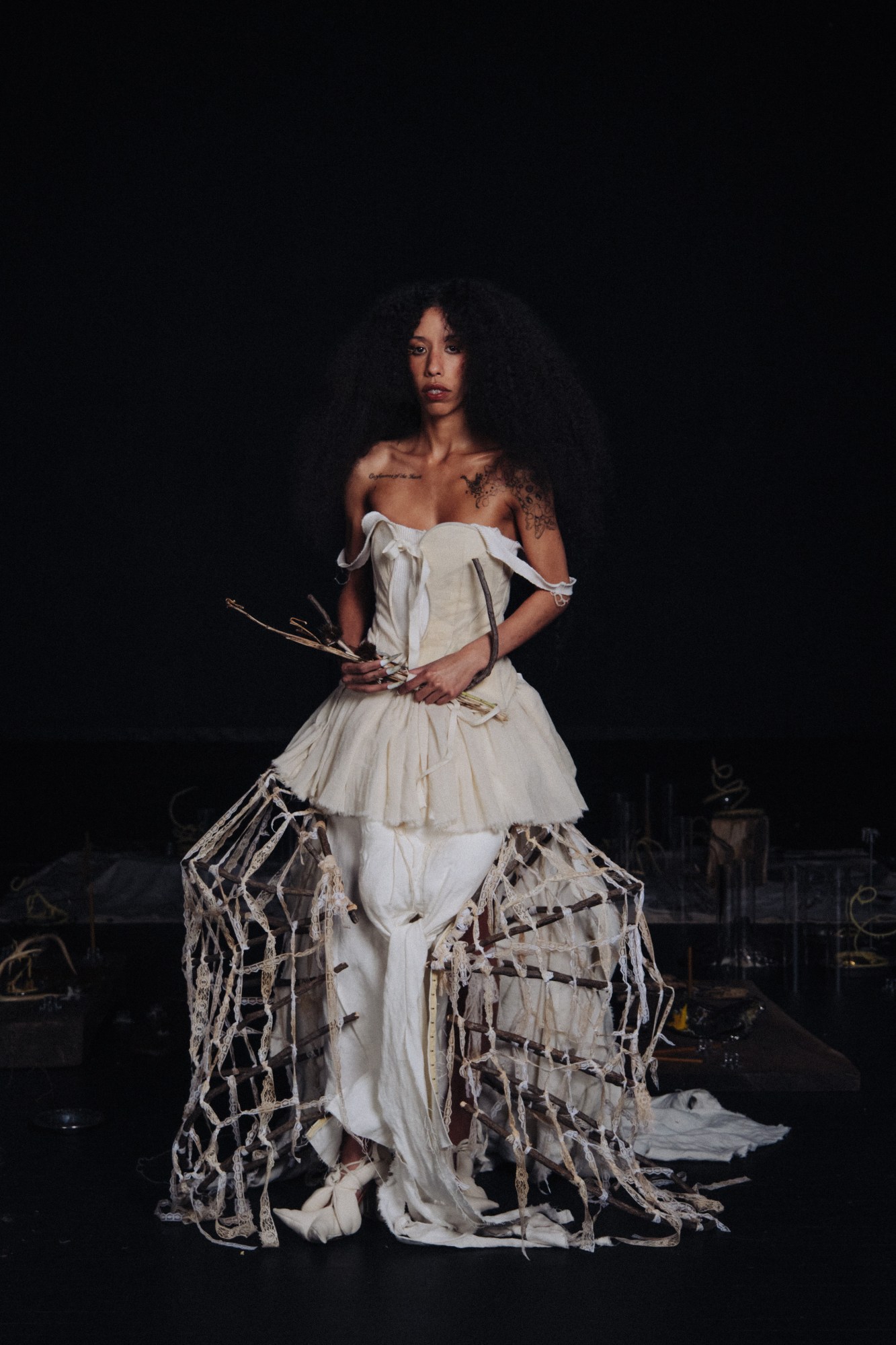 Alongside a small team, Whalen sews—and also weaves, waxes, or sculpts—every piece in her studio. Instead of creating brand new thematic collections twice a year, she prefers to build upon recurring silhouettes, indulging in experimentation and evolution. There’s an alchemical tradition at the heart of Whalen’s practice. Her reliance on deadstock fabrics ennobles materials deemed worthless by previous owners while historical shaping elements like panniers and bustles are designed to cradle rather than restrict. “I use them for their beauty and to recreate a narrative of tenderness and love,” she explains. “I think of my practice as almost a study and celebration of the human form.”
