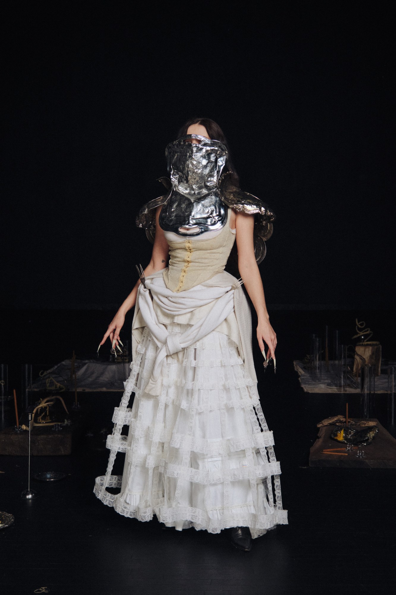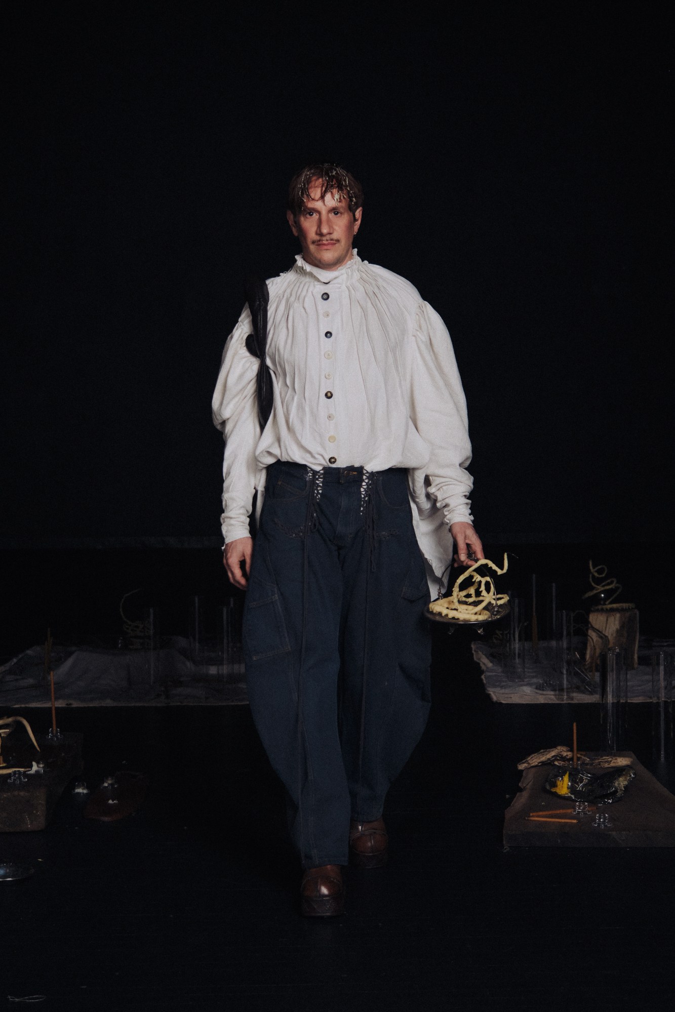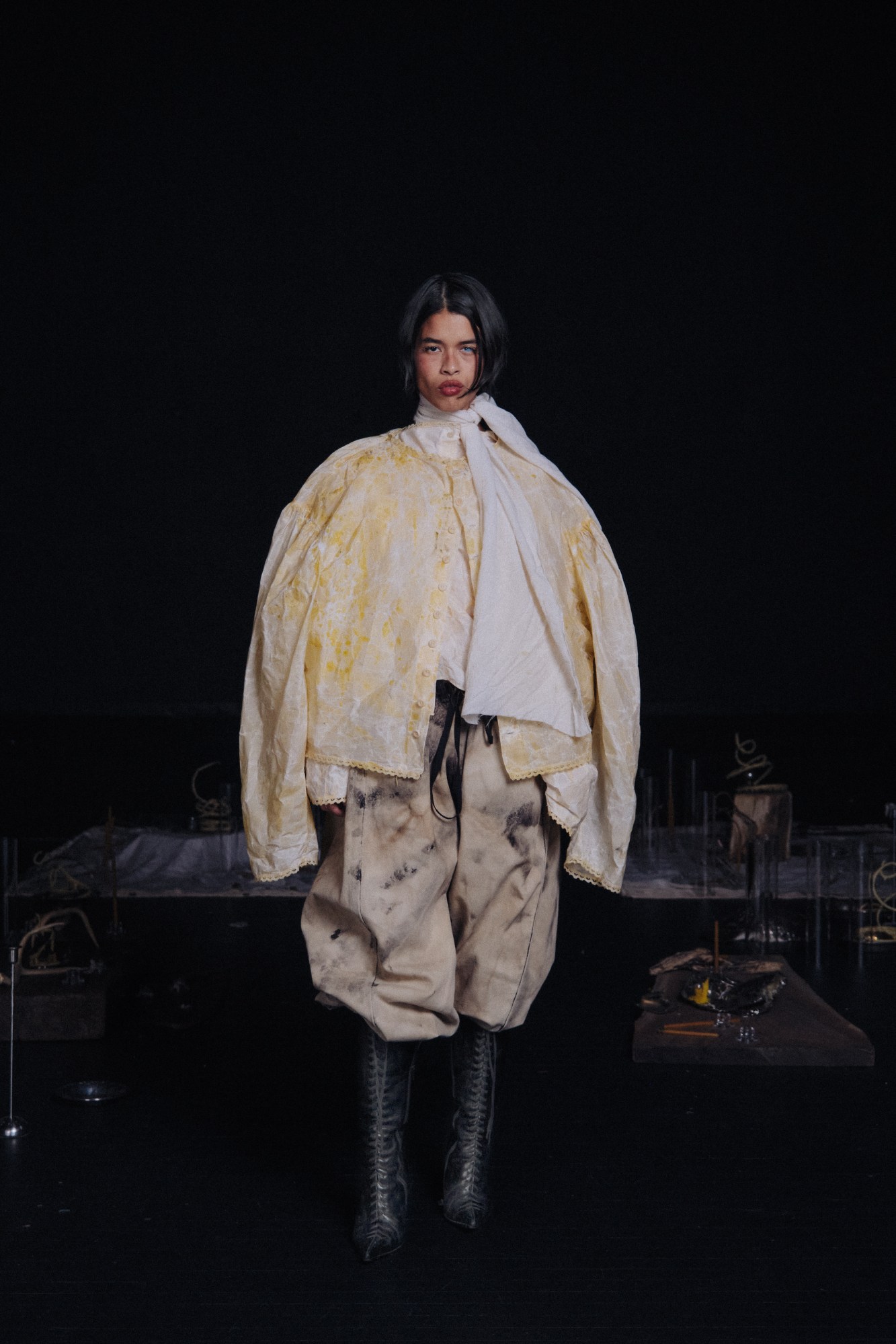 Zoe Gustavia Anna Whalen’s Fall 2025 show was illuminated solely by candles. The effect was shadowy and sensuous: D.S. and Durga perfumed the room while an eerie and mystical score conjured a reverential ambience. A procession of romantic silhouettes floated through the amber glow: babydoll blouses dipped in wax, a hoop skirt constructed from vine and lace, and a gauzy tea-stained gown. Even if the details were obscured, the perspective was lucid.