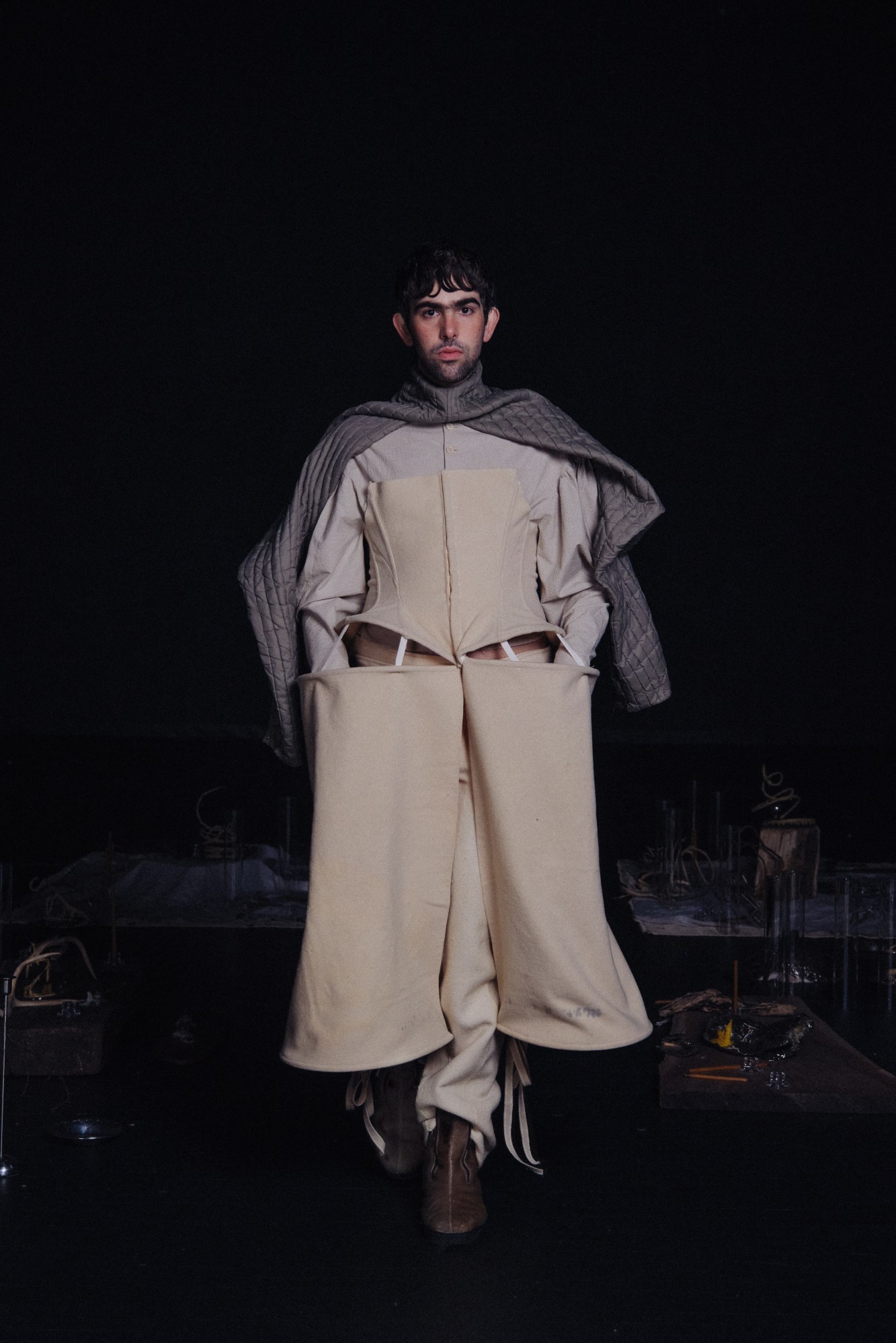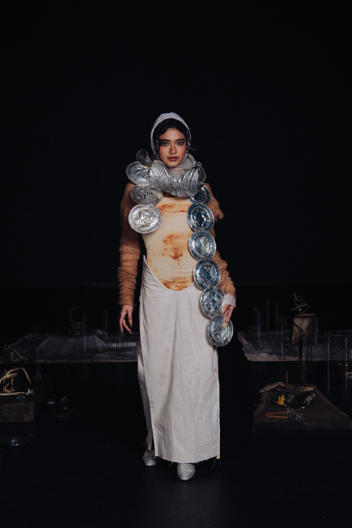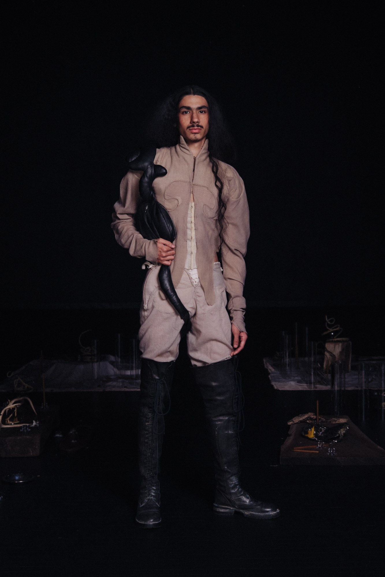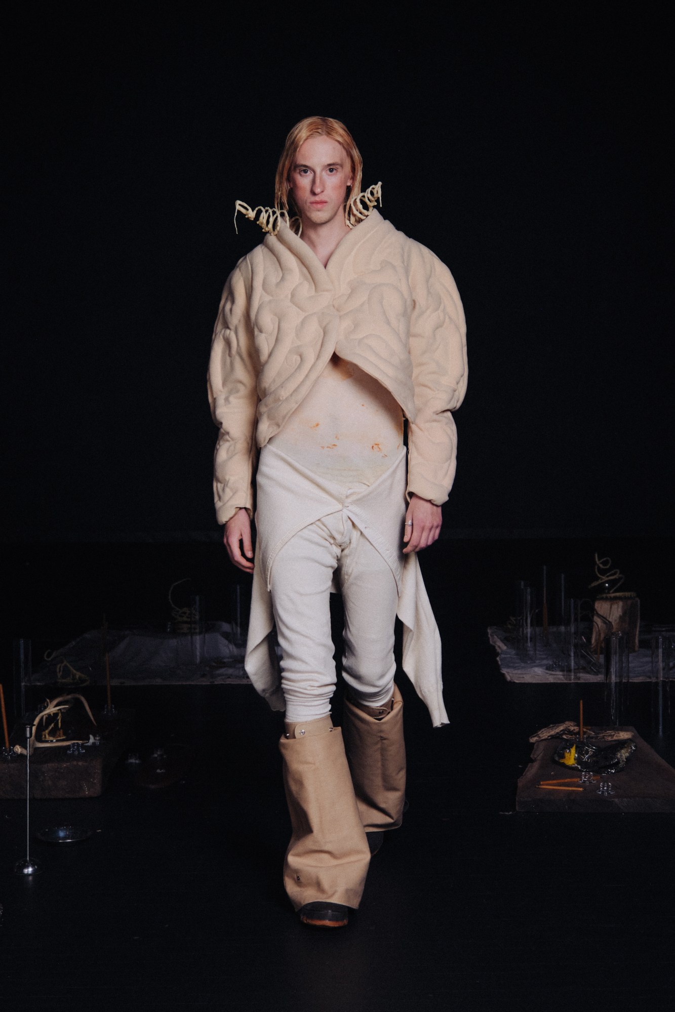 Zoe Gustavia Anna Whalen’s Fall 2025 show was illuminated solely by candles. The effect was shadowy and sensuous: D.S. and Durga perfumed the room while an eerie and mystical score conjured a reverential ambience. A procession of romantic silhouettes floated through the amber glow: babydoll blouses dipped in wax, a hoop skirt constructed from vine and lace, and a gauzy tea-stained gown. Even if the details were obscured, the perspective was lucid.